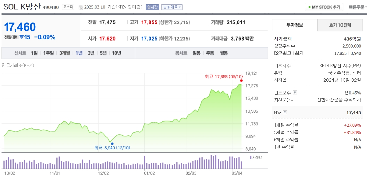 2위 역시 방산주입니다. SOL K방산 ETF는 신한자산운용의 상품이고요. 2024년 10월 2일에 상장된 비교적 신규 종목입니다. 그런데도 3개월만에 81%가 넘는 수익률을 올렸네요.