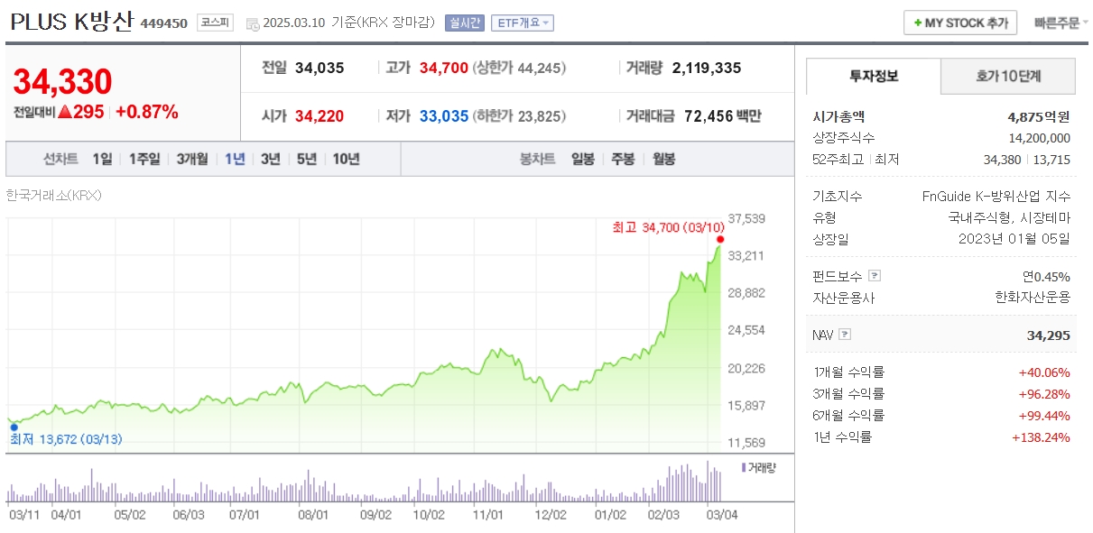 PLUS K방산과 마찬가지로 구성종목으로는 한화에어로스페이스, 현대로템, 한국항공우주, LIG넥스원, 한화오션 등이 있습니다.